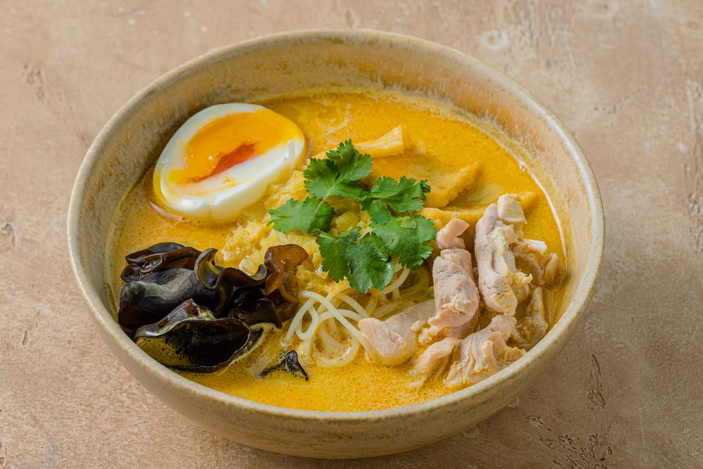 Ингредиенты:вода, паста карри, соус рыбный, лук репчатый, чеснок, масло растительное, корень имбиря, бульон куриный концентрат, молоко кокосовое, лемонграс, лапша яичная, масло растительное, яйцо куриное отварное, филе куриное, сладкий чили соус, грибы древесные муэр, тофу, масло растительное, кинза