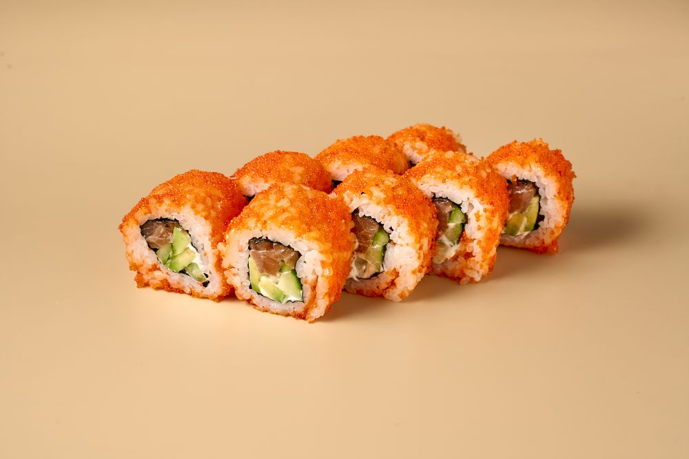 Состав: лосось, авокадо, свежий огурец, японский майонез, тобико