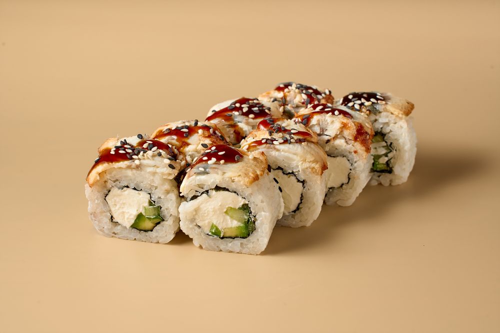 Состав: копченый угорь, сливочный сыр, авокадо, свежий огурец, соус терияки, кунжут