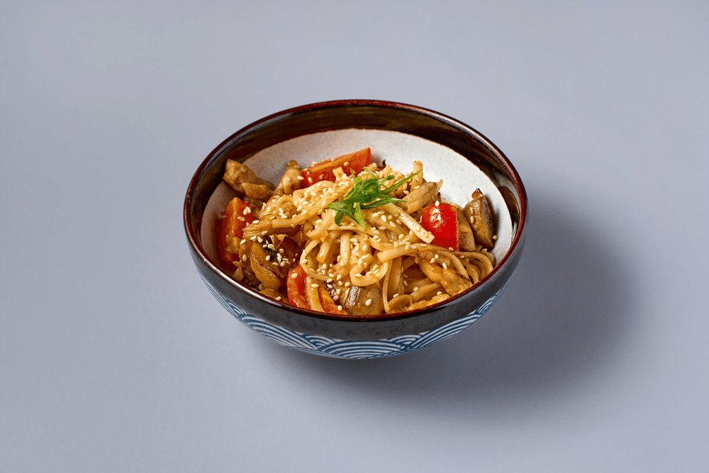 Ингредиенты:лапша удон отварная (лапша удон, вода, масло растительное), филе куриного бедра, черри, шампиньоны, соус том ям (паста том ям, соус чили сладкий, масло сливочное 82,5%, кокосовое молоко, соевый концентрат), сливки 22%, кокосовое молоко, кунжут кимчи (кунжут, соус кимчи), лук зеленый