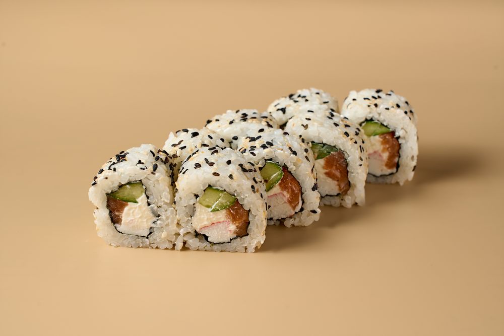 Состав: лосось, крабовые палочки, сливочный сыр, свежий огурец, кунжут