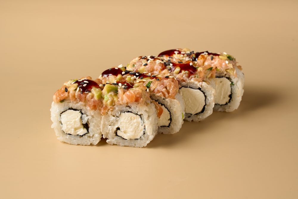 Ингредиенты:рис, вода, уксус рисовый, сахар, соль, лимон, водоросли нори, сыр сливочный, лосось, лук зеленый, авокадо, майонез, соус устричный, соус терияки, кунжут