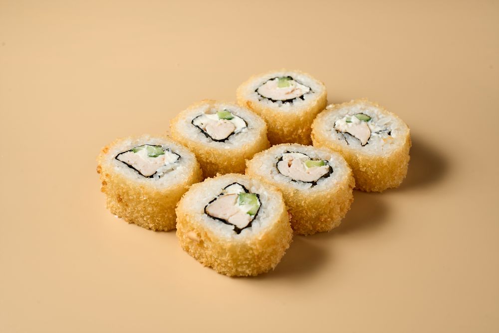Ингредиенты:рис, вода, уксус рисовый, сахар, соль, лимон) водоросли нори, сыр сливочный, огурец, курица копченая, кляр темпура, сухари панко, масло растительное