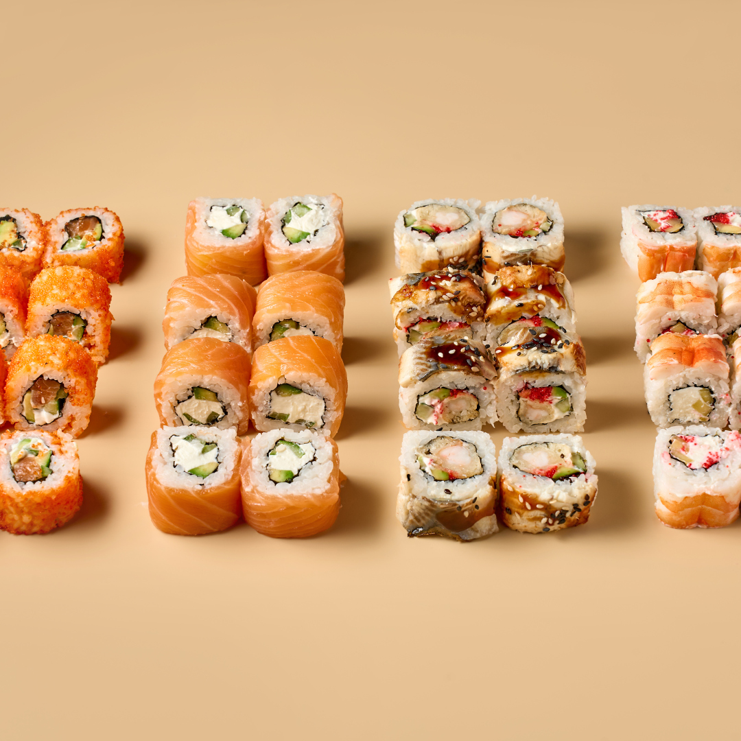 Филадельфия люкс 8 шт., Манеки 8 шт., Хи-но-Уме 8 шт., Калифорния с лососем 8 шт.