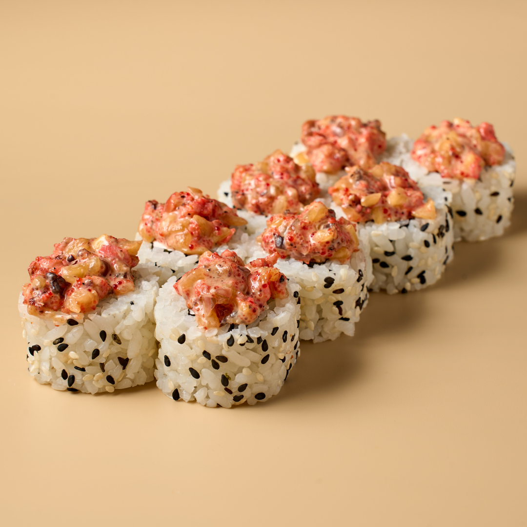 Копченый угорь, манго, хрустящие хлопья, тобико, соус спайс, сливочный сыр, авокадо, соус терияки, кунжут.