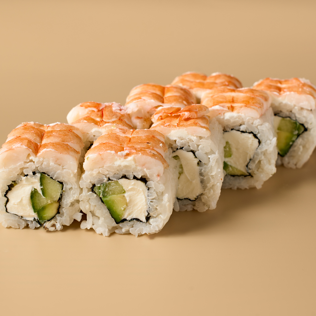 Тигровые креветки, сливочный сыр, авокадо, свежий огурец.