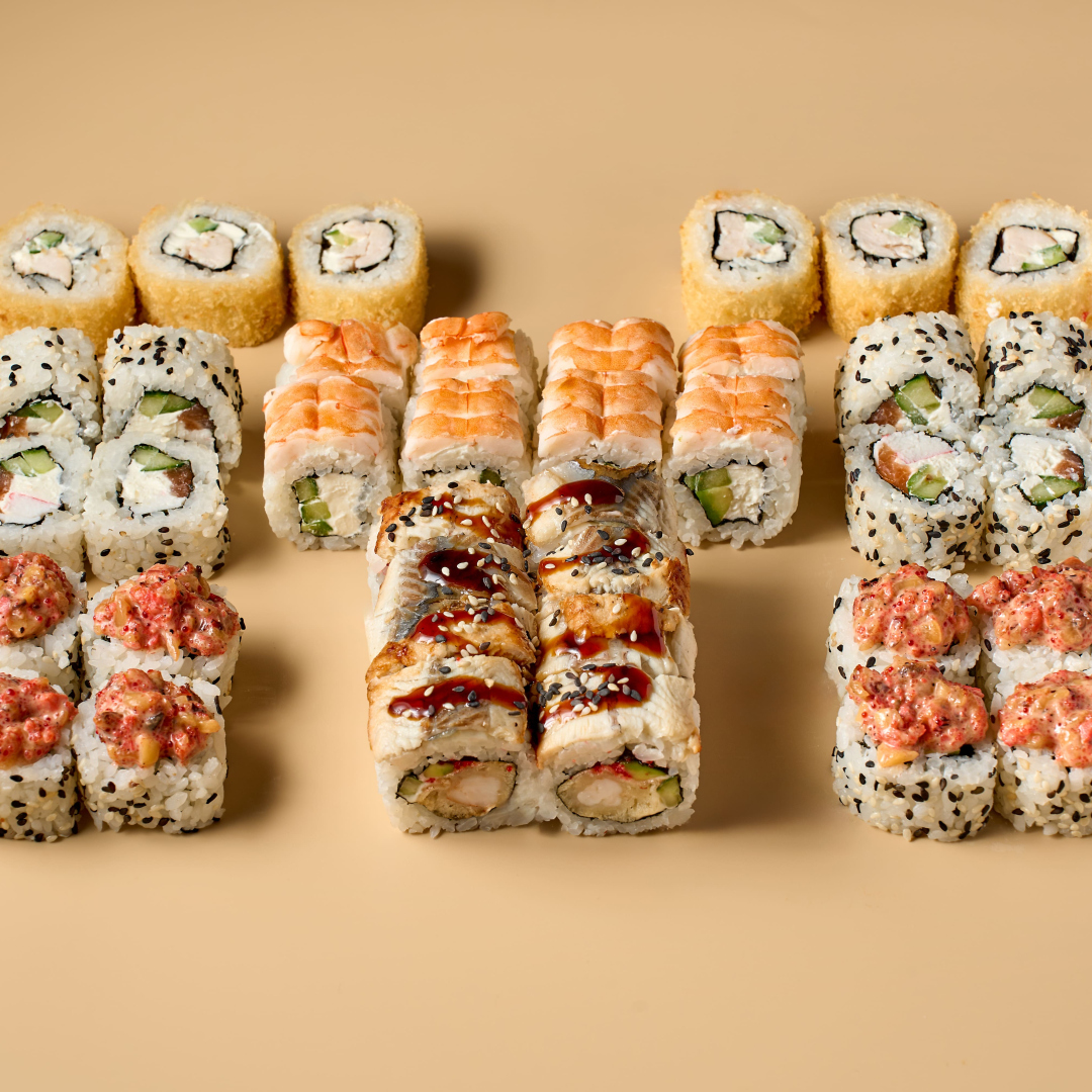 Манеки 8 шт., Филадельфия с креветкой 8 шт., Сендай 8 шт., Рисутеки 8 шт., Жареный ролл с курицей 6 шт.