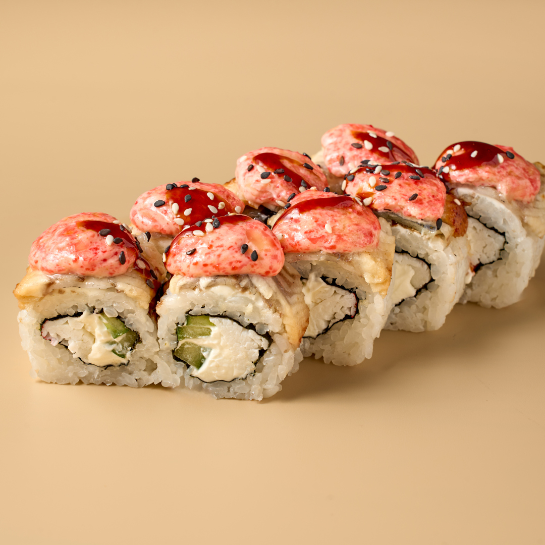 Копченый угорь, сливочный сыр, авокадо, свежий огурец, соус терияки, кунжут.