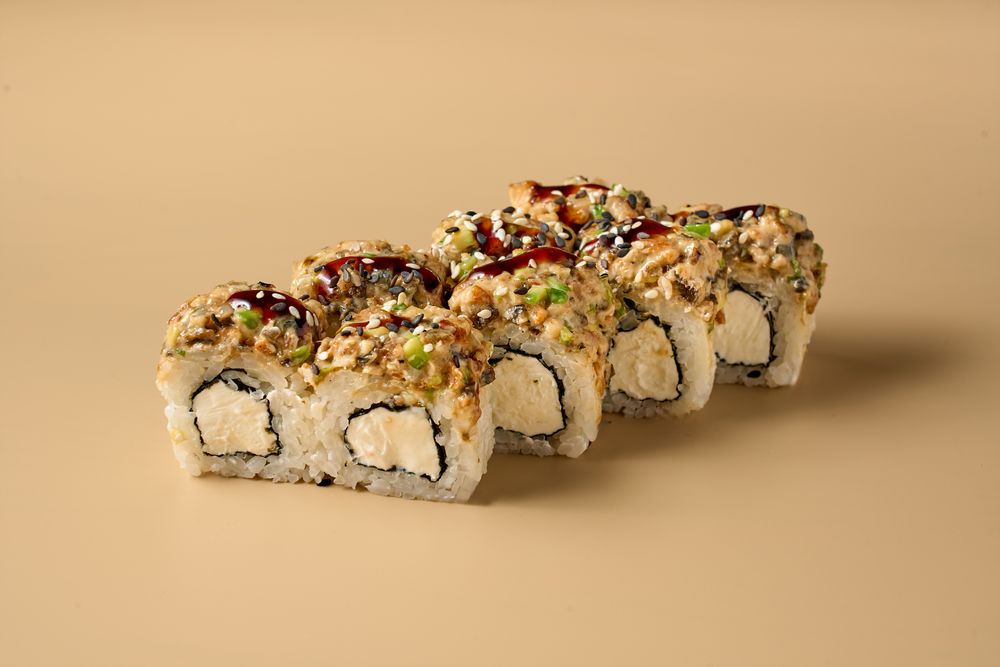 Состав: копченый угорь, авокадо, японский майонез, зеленый лук, устричный соус, сливочный сыр, соус терияки, кунжут