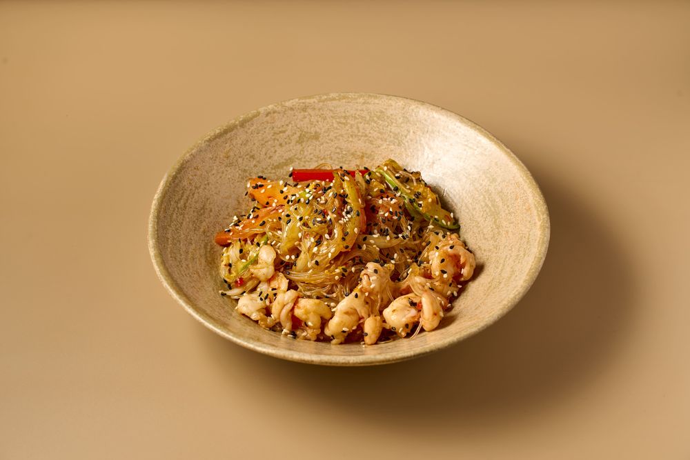 Ингредиенты:тигровые креветки, кабачки, морковь, пекинская капуста, перец болгарский, стеклянная лапша, соус чили сладкий, устричный соус, чесночное масло, кунжут, зеленый лук