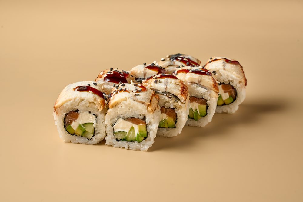 КБЖУ:481/14/19/62 Ингредиенты:рис, вода, уксус рисовый, сахар, соль, лимон, водоросли нори, сыр сливочный, огурец, авокадо, угорь, лосось, соус терияки, кунжут Выход:220г