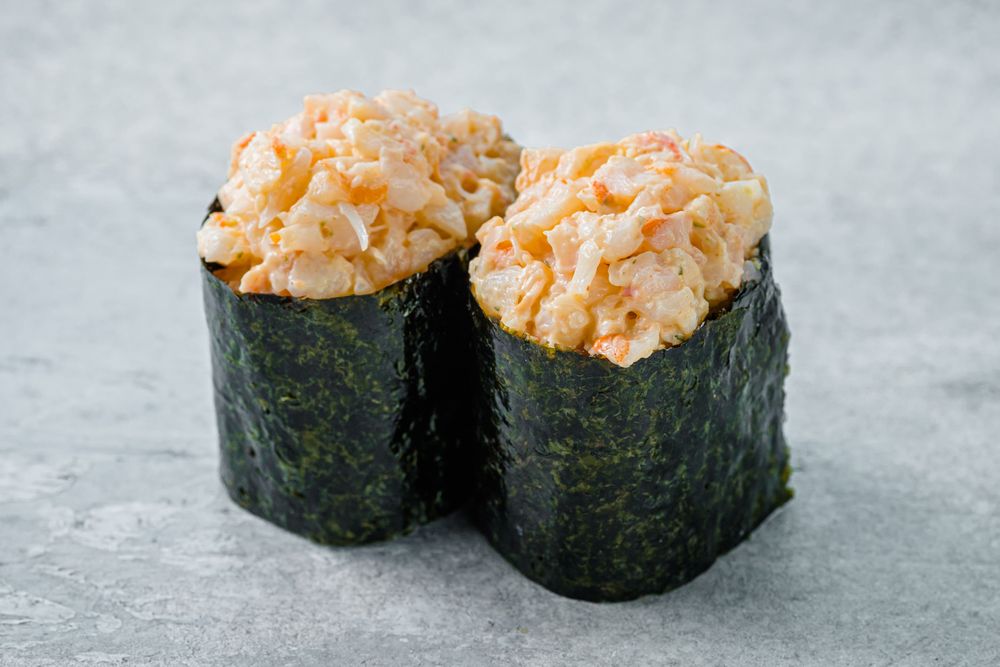 Ингредиенты: рис, вода, уксус рисовый, сахар, соль, лимон, креветки тигровые, водоросли нори, чеснок, лук красный, кинза, соус кимчи, паста табаджан, соль, майонез, перец чили красный, сахар