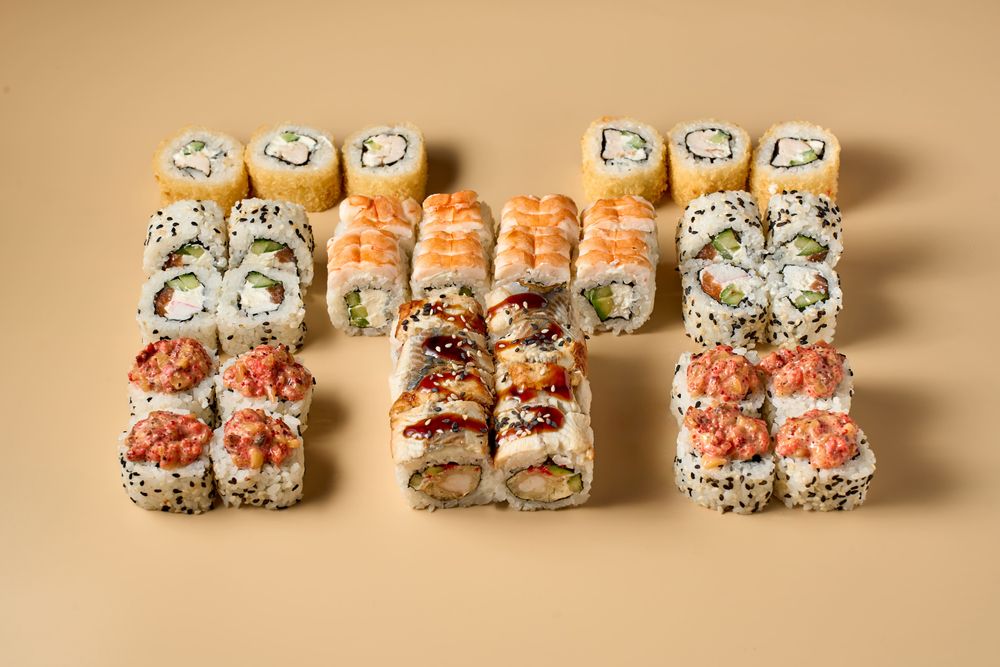 Ингредиенты:рис, вода, уксус рисовый, сахар, соль, лимон, водоросли нори, огурец, икра летучей рыбы, майонез, авокадо, угорь, масло растительное, креветки тигровые, кляр темпура, сыр сливочный, авокадо, угорь, чеснок, лук красный, кинза, соус кимчи, соль, майонез, перец чили красный, сахар, манго, икра летучей рыбы, соус терияки, кунжут, копченая курица, сухари панко, крабовые палочки