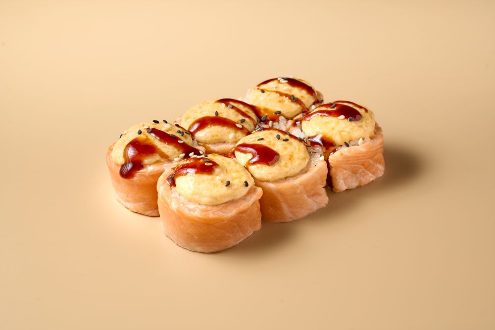 Состав: лосось, сурими, огурец, сливочный сыр, соус для запекания, терияки, кунжут
