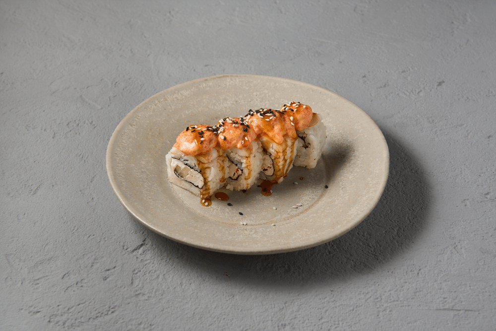 Ингредиенты:рис для суши (рис, вода, уксус рисовый, сахар, соль, лимон), водоросли нори, сыр сливочный, огурец, палочки крабовые, креветки тигровые, соус для запекания с тобико (майонез, сыр гауда, соус кимчи, чеснок, икра летучей рыбы), соус терияки (вино белое, уксус рисовый, концентрат соевый, мед, сок имбиря, крахмал кукурузный, сахар), кунжут,имбирь маринованный, васаби